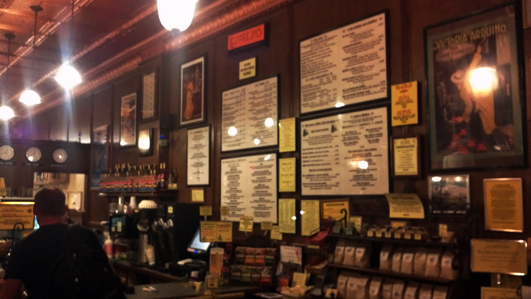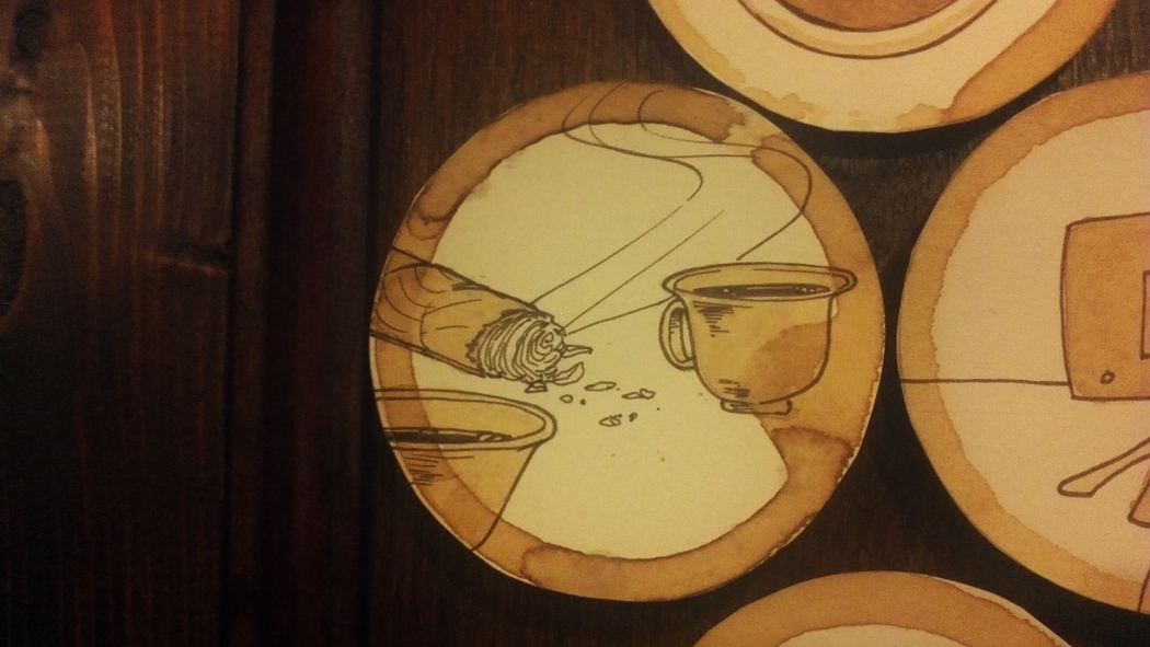 Perhaps the only thing more varied than the clientele and eclectic conversation topics is the art work that adorns the dark wooden walls. Typical photographs of Parisian café scenes are jutted up against unique paintings of 50’s diners and old posters with beautiful typefaces. At first glance, the decor seems to be unremarkable and painfully cliché. However, if you take a longer look at the walls you’ll start to notice pieces and details that ignite your brain to light up with a question mark. On the west wall there is a small sculpture of a nose; an eye on the south wall and its partner on the east. I have yet to find the rest of the pieces that comprise the complete face but at least there is comfort found in knowing that the unknown face can watch over the shop from all directions and smell the acidic brews. There is a Gargoyle above the barista’s counter, standing watch next to the security camera and statue of a dog with a cocked leg, ready to chase any unwelcomed coffee drinking miscreants through the door. A unique illustration of a Skelton smoking a cigarette hangs on the east wall, serving as a reminder to disgruntled writers who spend too few hours putting words on paper.