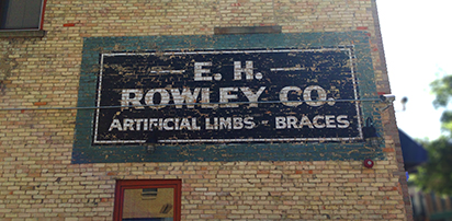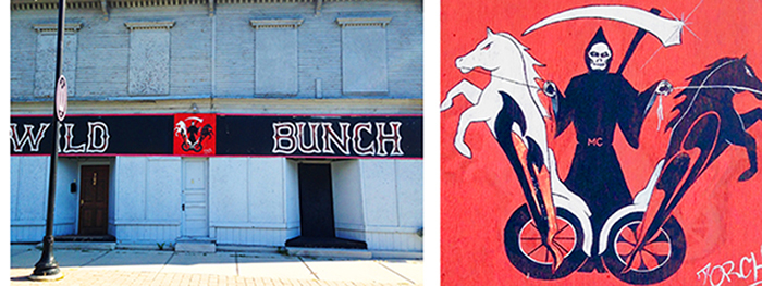 Where traditional graffiti is sparse, historical and handmade signage is plentiful in Michigan’s second largest city. Once a hub for rough and tumble industrialism, the city is awash in ghost signage advertising working class necessities, watering holes and social clubs. One such piece is painted on the Wild Bunch biker club’s hangout on Wealthy Street. The hand-painted mural, with its grim reaper and chariots sneer at those who happen to walk by the white, boarded up structure. The mural, out of place in a neighborhood now known for pubs, organic groceries, and antiques, perfectly expresses the temperament of a city once known for timber, furniture, car parts and beer.