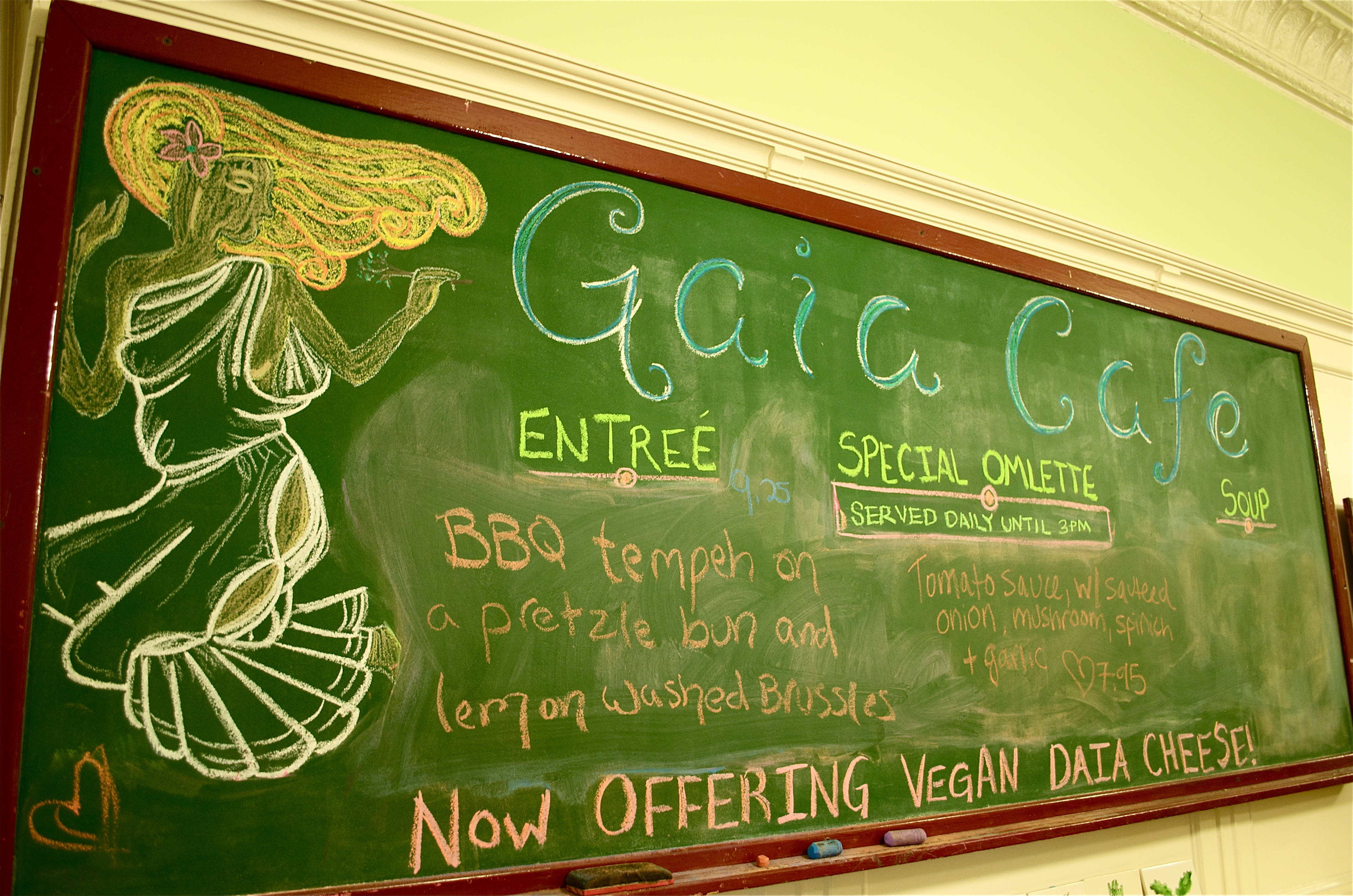 In an age of fad diets Gaia Café has held on to the roots of vegetarianism. Offering a complete plant based menu since the 1970’s, the restaurant defies ever-changing dieting trends. Fittingly situated in the progressive East Hills district of Grand Rapids, the restaurant truly embodies its namesake. The Greek goddess Mother Earth is integrated in the restaurant’s humble façade, natural décor, and commitment to sustainable foods. The original brown brick exterior, weathered wooden front door, and storefront sign swaying gently above the entrance welcomes those looking for a home kitchen atmosphere and a feel good meal.