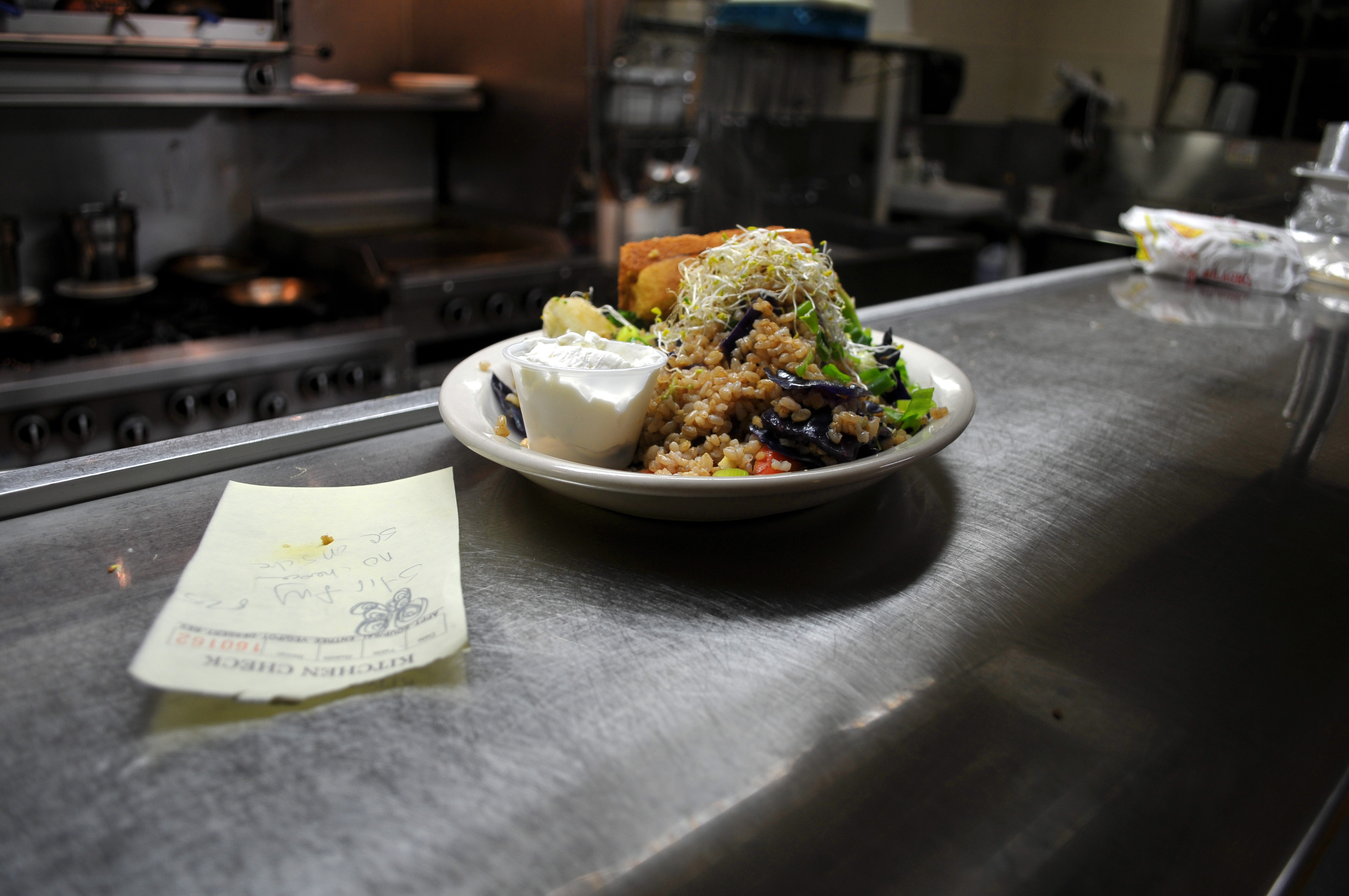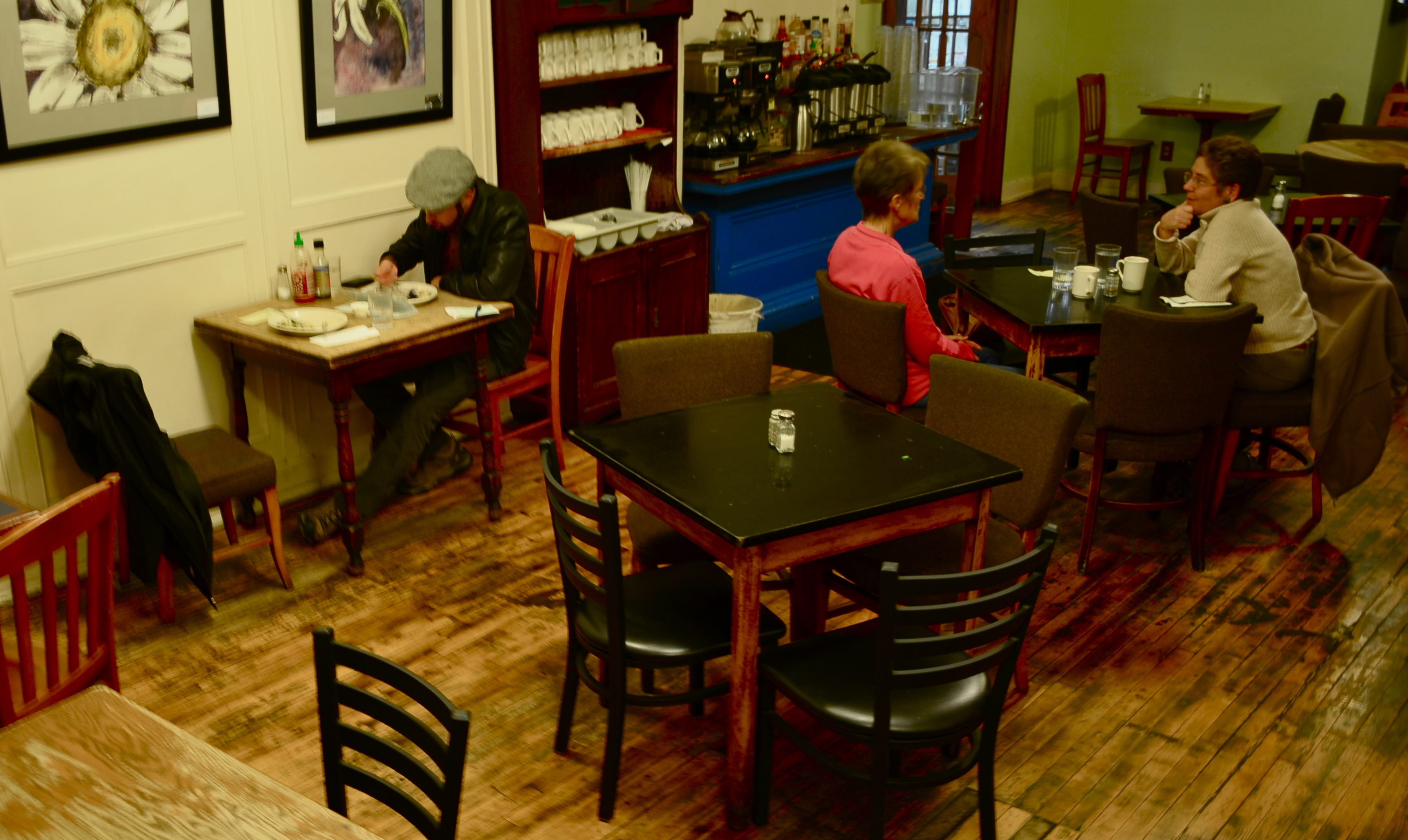 The semi-self serve dining room offers a unique hands on dining experience thereby adding to the familial vibe. After crossing the original wood floor and choosing your table, you are encouraged to help yourself to fresh coffee and water. Once the food arrives you may pick from an array of sauces. The seemingly endless supply of Sriracha and Gaia salsa are behind the coffee pots and water.