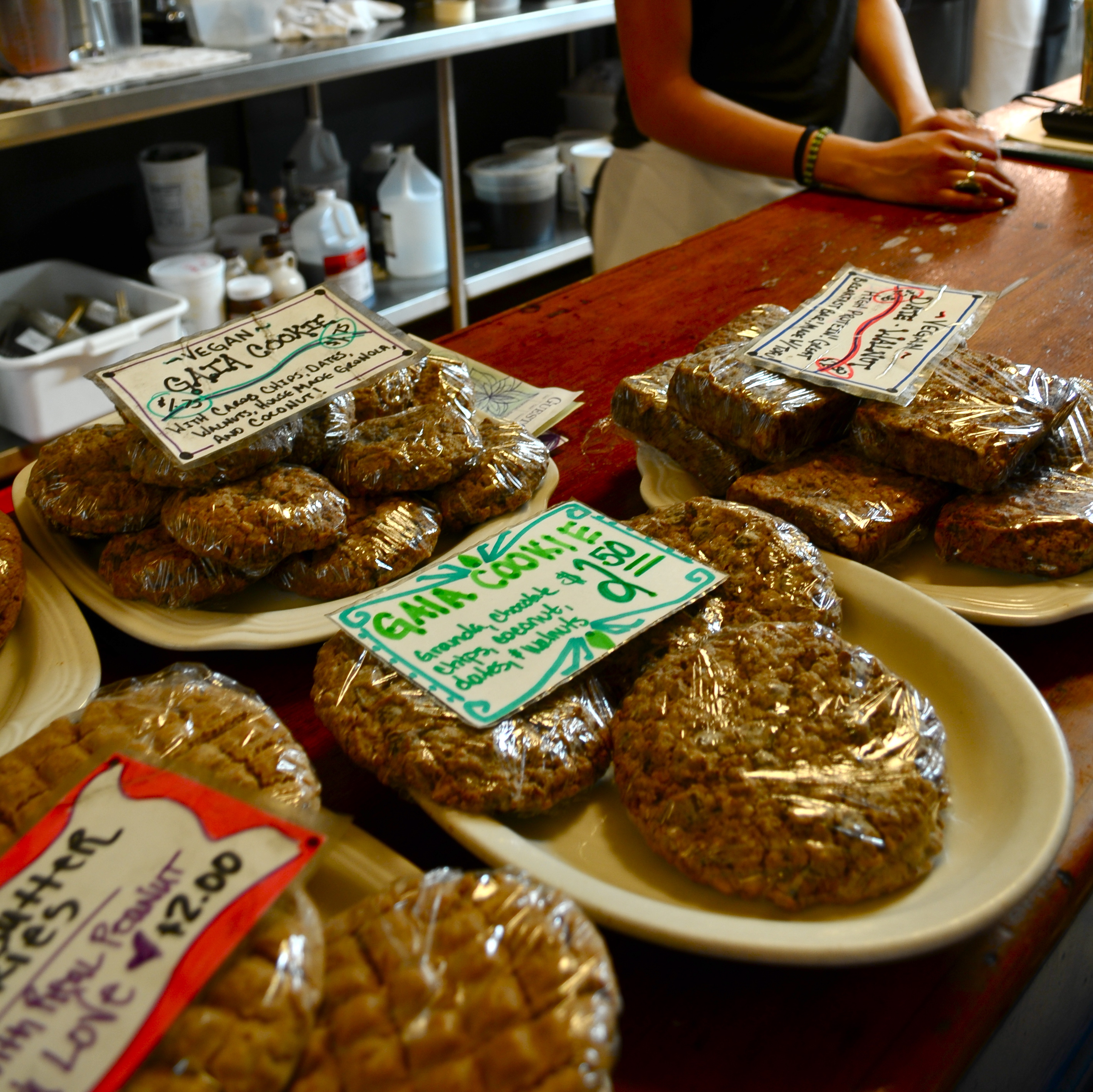 The main dishes are anything but barren and bland. The flood of flavors lead you to believe that Mother Earth herself nursed the edible foliage to fruition. The Veggie Hash beautifully marries the naturally sweet flavors of vegetables with the sharp bite of garlic and is displayed over a bed of seasoned potatoes. The Cuban Grilled Tempeh is the precious love child between soy and latin spices wrapped in a corn tortilla. If the thought of tofu, tempeh, and other soy based products makes you skeptical, try one of their remedial fresh juice blends. No matter if you are nursing a hangover with the Mac Truck or locating the fountain of youth with the Tiones Elixir you are guaranteed a natural energy boost soon after your last sip. Of course, if the main course fails to satiate your appetite, do not hesitate to indulge in at least one of Gaia’s hearty cookies packed full of walnuts, dried cherries, and dates that are tauntingly perched next to the cash register.