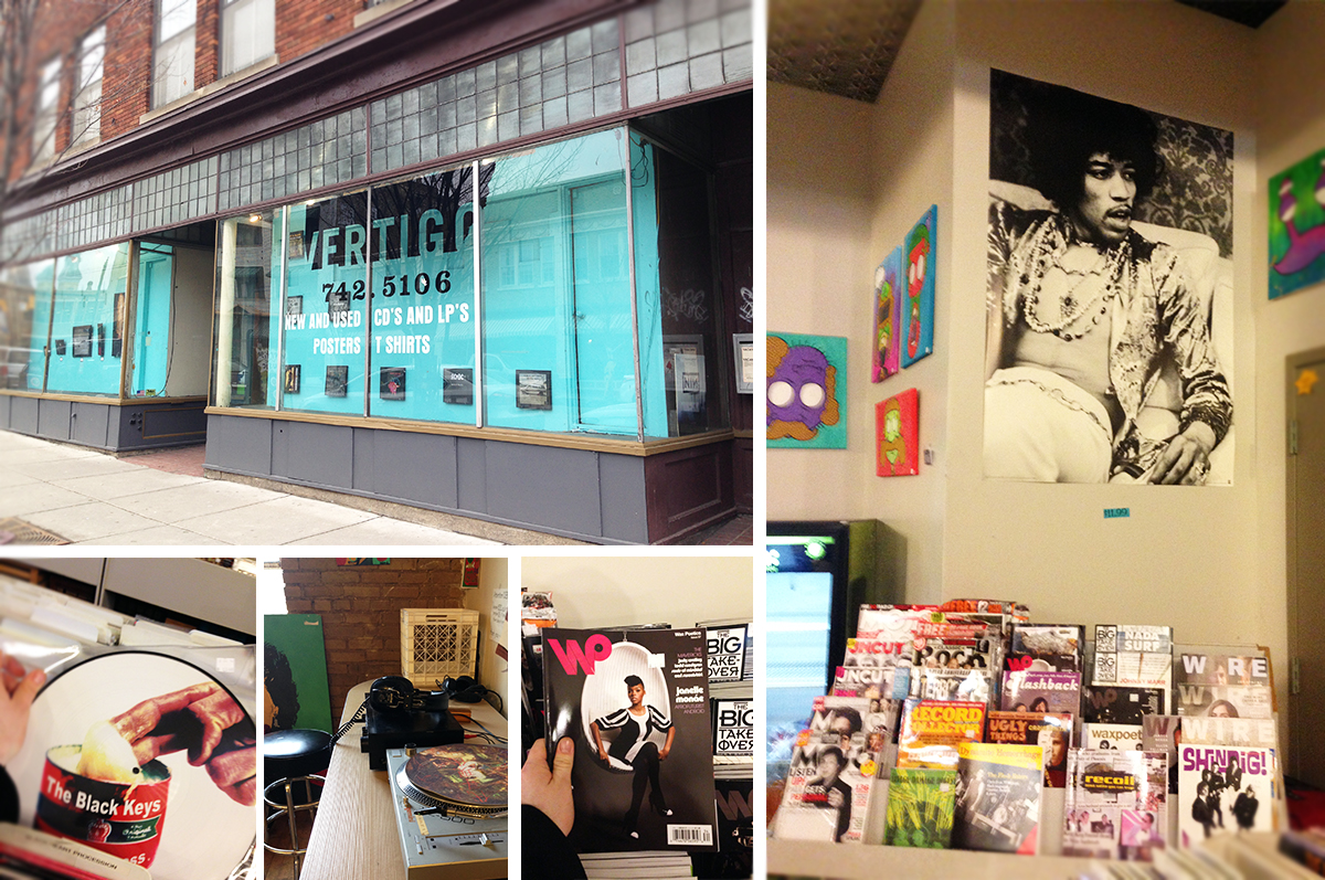 A record store is seldom just a record store. It’s often a gathering spot where music lovers congregate, eyeball one another and explore the art form they hold dear. There are different kinds of record stores; some are dank, cramped little joints that smell like an old man’s pants and cat piss, while others are lavish sound boutiques with perfectly arranged collections that seem too pristine to touch. Vertigo Records in Grand Rapids isn’t in either of these two camps. The store sits on Division Street in a tumultuous neighborhood, south of the city’s downtown. Surrounded by ghostly figures wafting in and out of liquor stores, transients hiding in the shadows of doorways, boarded up dive bars and condemned storefronts, Vertigo’s facade is easy to miss. The shop’s black logo blends perfectly into the street’s dreary urbanity.